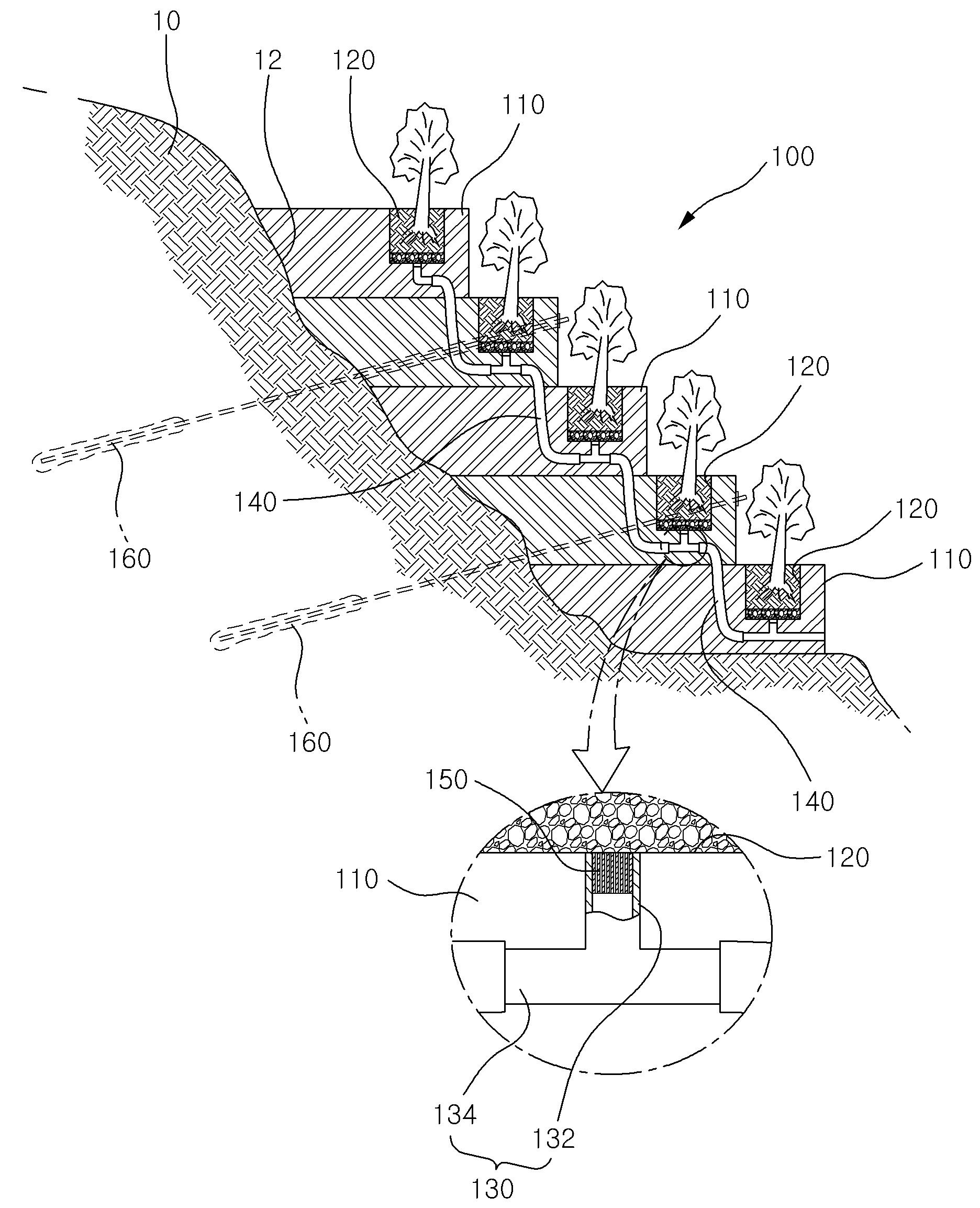 º» ¹ß¸íÀº ¿¬¼º°üÀ» ÀÌ¿ëÇÑ ¿¬Á÷ ¹è¼öÇü ģȯ°æ °è´Ü½Ä ¿Ëº® ¹× ÀÌÀÇ ½Ã°ø¹æ¹ý¿¡ °üÇÑ °ÍÀ¸·Î, ÀýÅä»ç¸éÀÇ Á¤¸®¸é »ó¿¡ ö±ÙÀÇ ¹è±Ù ÈÄ ¿¬¼º°ü°ú ÁöÇ¥¼ö À¯Ãâ°üÀ» ¹è°üÀ» ÅëÇØ ÄÜÅ©¸®Æ® Ÿ¼³À» ÇÏ¿© °è´Ü½Ä ¿Ëº®À» ½Ã°øÇÒ ¼ö ÀÖµµ·Ï ÇÔÀ¸·Î½á ¿Ëº®ÀÇ ½Ã°øÀ» º¸´Ù ¿ëÀÌÇÏ°Ô ÇÒ ¼ö ÀÖµµ·Ï ÇÑ ¿¬¼º°üÀ» ÀÌ¿ëÇÑ ¿¬Á÷ ¹è¼öÇü ģȯ°æ °è´Ü½Ä ¿Ëº®À» Á¦°øÇÔ¿¡ ±× ¸ñÀûÀÌ ÀÖ´Ù. À̸¦ À§ÇØ ±¸¼ºµÇ´Â º» ¹ß¸íÀº µµ·Î, Á¦¹æ, öµµ ¶Ç´Â ÅͳÎÀÇ ±¸ÃâÀ» À§ÇÑ ¹ý¸é, ÀýÅä»ç¸é, Àý¼ºÅä ¶Ç´Â ºØ¶ô°æ»ç¸é¿¡ °è´Ü½ÄÀ¸·Î Çü¼ºµÇ´Â ¿Ëº®ºÎ¿Í ¿Ëº®ºÎÀÇ °è´Ü¸é »ó¿¡ ½Ä¹°ÀÇ ½ÄÀç°¡ ÀÌ·ç¾îÁö´Â ½ÄÀçºÎÀÇ ±¸¼ºÀ¸·Î ÀÌ·ç¾îÁø °è´Ü½Ä ¿Ëº®¿¡ ÀÖ¾î¼, ¿Ëº®ºÎ °¢°¢ÀÇ ½ÄÀçºÎ ÇϺÎÃø¿¡ ÀμƮ ¼³Ä¡µÇ¾îÁöµÇ ½ÄÀçºÎ ÇϺηκÎÅÍ ÁöÇ¥¼öÀÇ À¯ÀÔÀÌ ÀÌ·ç¾îÁö´Â À¯µµ°ü°ú À¯µµ°ü ÇϺηκÎÅÍ ºÐ±âµÇ´Â ºÐ±â°üÀÌ ÀÏü·Î Çü¼ºµÈ ÁöÇ¥¼ö À¯Ãâ°ü; ¿Ëº®ºÎ °¢°¢¿¡ ÀμƮ ¼³Ä¡µÈ ÁöÇ¥¼ö À¯Ãâ°üÀ» »óÈ£ ¿¬°áÇ쵂 ÇÏÀ§ÀÇ ¿Ëº®ºÎ ÇϺο¡ ¼³Ä¡µÈ ÁöÇ¥¼ö À¯Ãâ°üÀÇ ºÐ±â°ü ÈĴܰú »óÀ§ÀÇ ¿Ëº®ºÎ ÇϺο¡ ¼³Ä¡µÈ ÁöÇ¥¼ö À¯Ãâ°üÀÇ ºÐ±â°ü ¼±´ÜÀ» ¿¬°áÇÏ´Â Ç÷º½ÃºíÇÑ ¿¬¼º°ü; ¹× ÁöÇ¥¼ö À¯Ãâ°üÀÇ À¯µµ°ü »ó´Ü ³»°æ¿¡ ¼³Ä¡µÇ¾î ½ÄÀçºÎ¿¡ ä¿öÁø ÈëÀ̳ª ±âŸ À̹°ÁúÀÌ À¯ÀԵǵµ·Ï ¾Êµµ·Ï ÇÏ´Â ÇÊÅ͸¦ Æ÷ÇÔÇÑ ±¸¼ºÀ¸·Î ÀÌ·ç¾îÁø´Ù